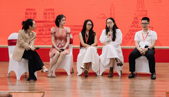 Chị Việt Anh (bìa trái) cùng các ứng viên giành học bổng chính phủ Pháp chia sẻ kinh nghiệm với sinh viên trường Đại học Ngoại thương, hôm 13/10. Ảnh: VFE