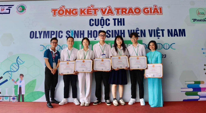 Thế Phương (thứ 2 từ phải qua) tại Cuộc thi Olympic Sinh học Sinh viên Việt Nam năm 2023. Ảnh: NVCC