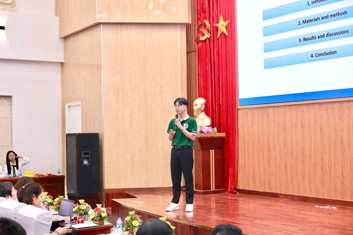 Thế Phương tại Hội nghị Sinh viên Nghiên cứu Khoa học, Khoa Sinh học, Trường Đại học Sư phạm Hà Nội năm 2024 với vai trò báo cáo viên. Ảnh: NVCC