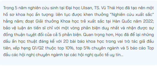 Anh đã tìm đến cộng đồng nghiên cứu sinh Việt tại Hàn Quốc, trong đó có TS. Phạm Quốc Việt - Quả Cầu Vàng 2021 để học hỏi và trao đổi. Với phương châm “cần cù bù thông minh”, Học tự đặt mình vào guồng làm việc cường độ cao, mỗi ngày bắt đầu từ 9 giờ sáng và thường kết thúc sau 1-2 giờ đêm, có hôm kéo dài tới 6-7 giờ sáng hôm sau khi thực hiện các thử nghiệm mô phỏng và tái lập kết quả. “Đọc tài liệu - thử nghiệm - sửa sai” trở thành nhịp điệu quen thuộc suốt 5 năm của chàng trai trẻ Nguyễn Thái Học tại phòng thí nghiệm của Đại học Ulsan.