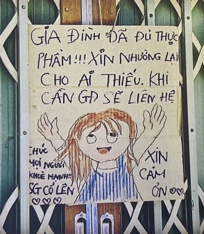 Một hộ gia đình treo thông báo nhường lại thực phẩm cho những gia đình còn thiếu. Ảnh: Sách ''Sài Gòn bao thương''