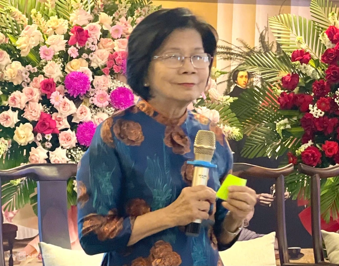 Nhà báo Vũ Kim Hạnh trong buổi ra mắt sách ở Hà Nội, ngày 14/9. Bà 74 tuổi, từng giữ chức tổng biên tập báo Tuổi Trẻ, Chủ biên phụ trách báo Sài Gòn Tiếp Thị. Hiện bà là Chủ tịch Hội Doanh nghiệp hàng Việt Nam chất lượng cao. Ảnh: Phương Linh