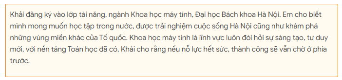 Thành tích này là sự tri ân của em gửi đến các thầy, cô ở Trường THCS Nguyễn Trãi (Hà Tĩnh) đã phát hiện, bồi dưỡng, khơi dậy tình yêu Toán học trong em và thầy cô ở ngôi trường THPT chuyên Phan Bội Châu đã giúp em hiện thực hóa ước mơ vàng Olympic Toán học quốc tế. Ở hành trình này, em cũng tìm lại được sự tự tin vào bản thân khi theo đuổi đam mê”, Khải xúc động chia sẻ.