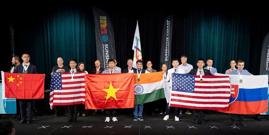 Võ Trọng Khải (cầm cờ Việt Nam) giành Huy chương Vàng Olympic Toán học quốc tế năm 2025.