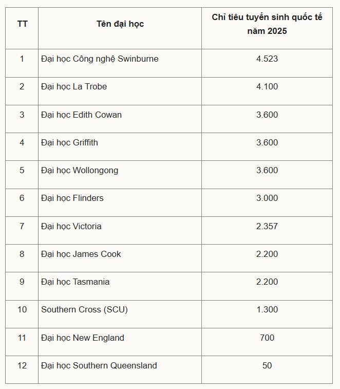 Trong 12 trường diện ưu tiên, Đại học Công nghệ Swinburne được tuyển hơn 4.500 sinh viên quốc tế, nhiều nhất. Theo sau là Đại học La Trobe với 4.100 chỉ tiêu. Ba trường Edith Cowan, Griffith và Wollong cùng được phân bổ 3.600 suất, còn lại nhận dưới 3.000.