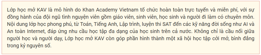 Tháng 3/2025, trong quá trình tìm kiếm một hoạt động ngoại khóa ý nghĩa, Gia Bảo tình cờ biết đến dự án Lớp học mở của KAV (Khan Academy Vietnam). Với 3 năm kinh nghiệm làm tình nguyện viên tại tổ chức giáo dục Steam For Vietnam, em nhận thấy đây là cơ hội để vừa rèn luyện bản thân, vừa góp phần lan tỏa tri thức công nghệ.
